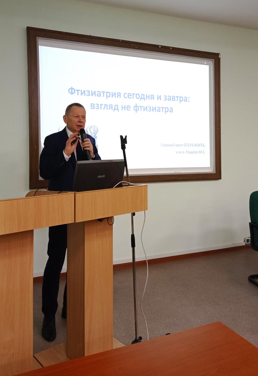 Конференцию открыл главный врач ИОКТБ Михаил Ефимович Кощеев докладом «Фтизиатрия сегодня и завтра: взгляд не фтизиатра».